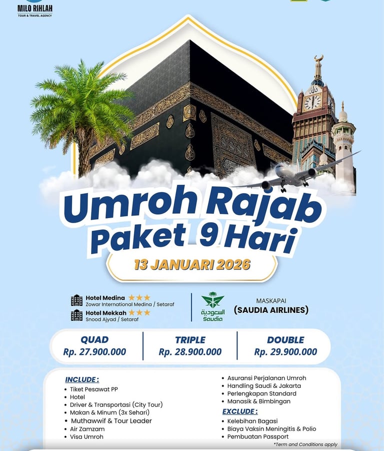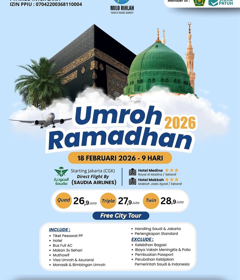Nikmati pengalaman umroh terbaik dengan Paket kami. Dapatkan fasilitas juga akomodasi yang nyaman, dan layanan istimewa selama perjalanan. Paket ini dirancang untuk memberikan kenyamanan dan kemudahan bagi Anda dan keluarga dalam menunaikan ibadah umroh.